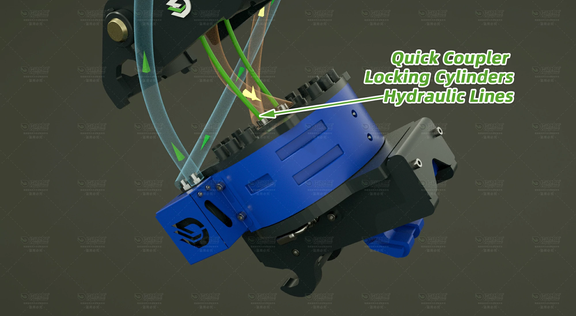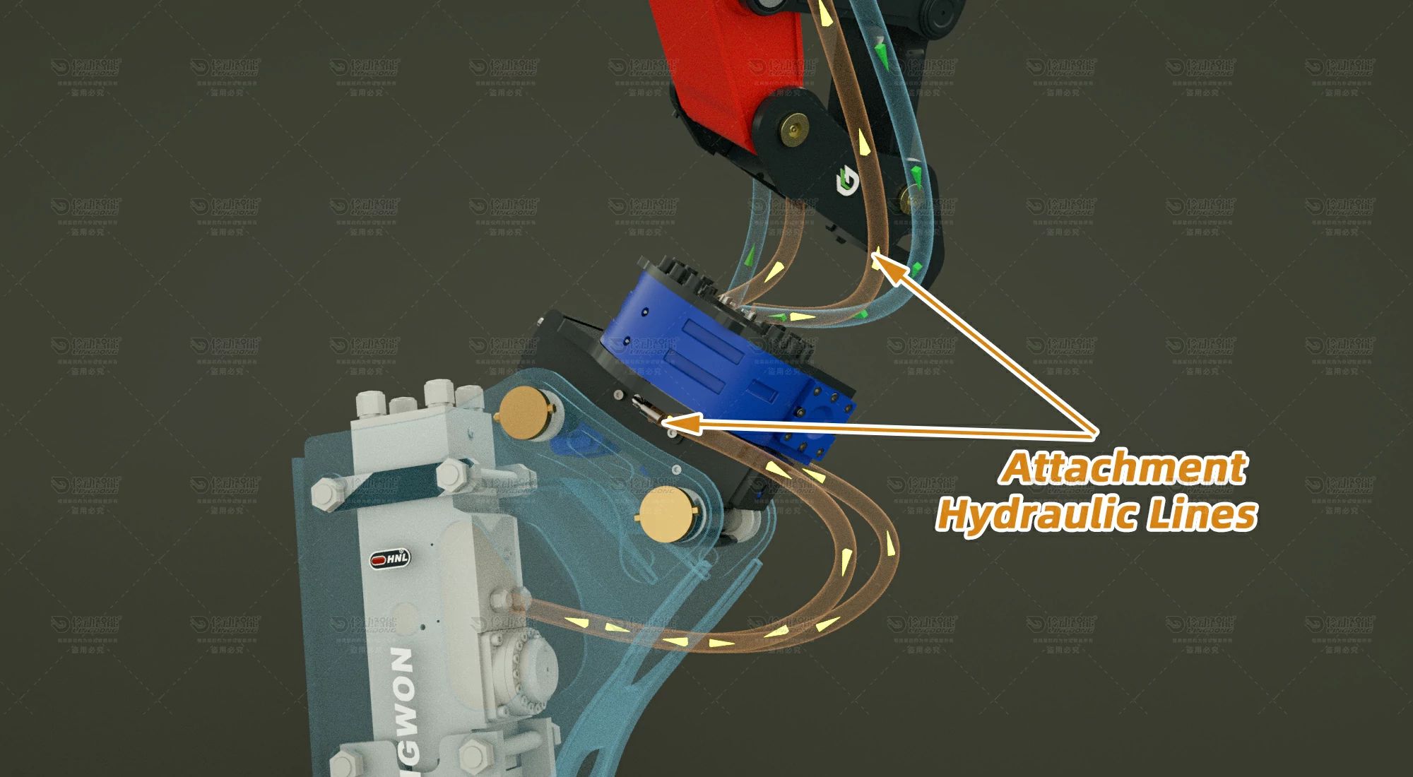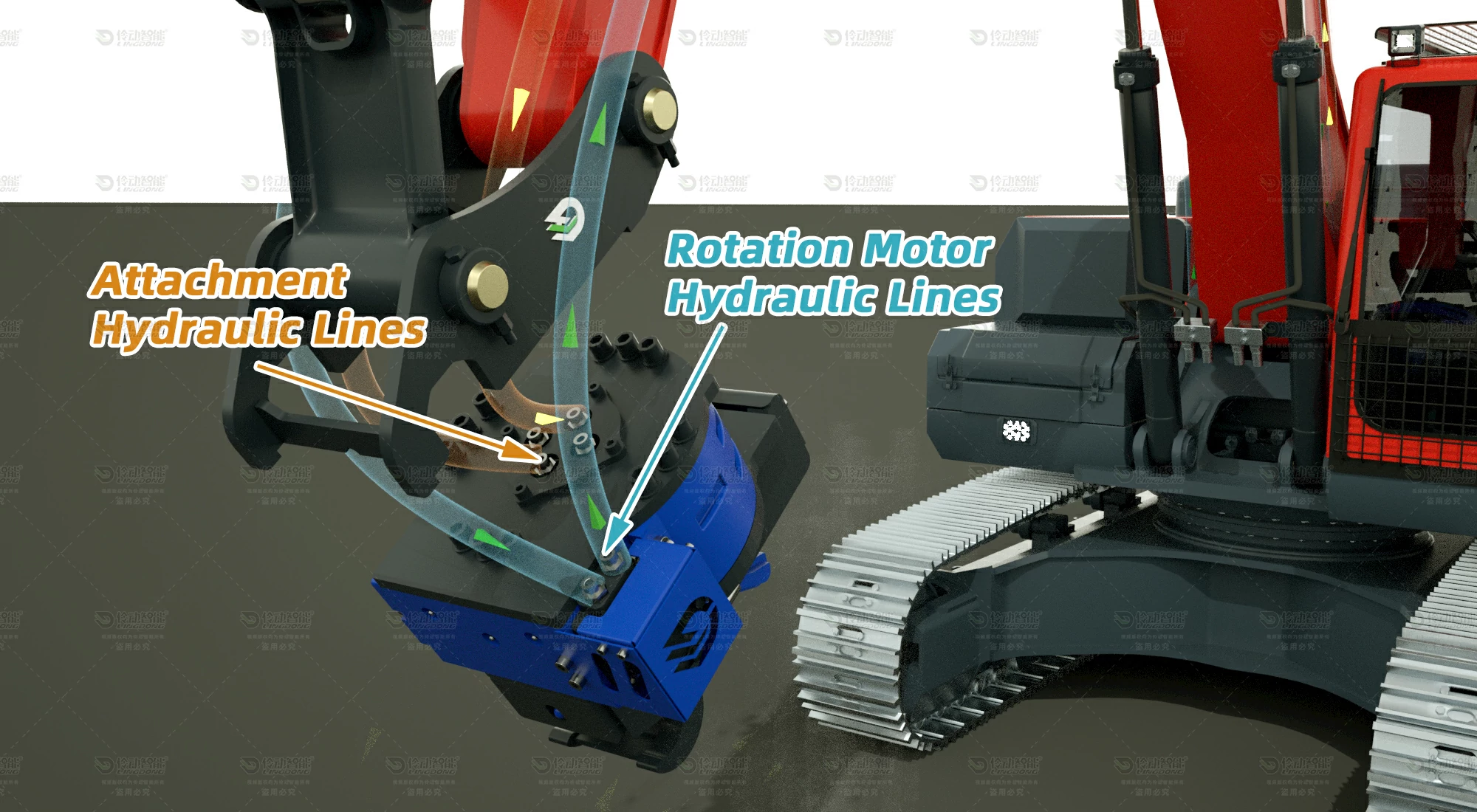 The orange lines connect to the central hydraulic swivel in the middle of the Lingdong Rotating Quick Coupler.